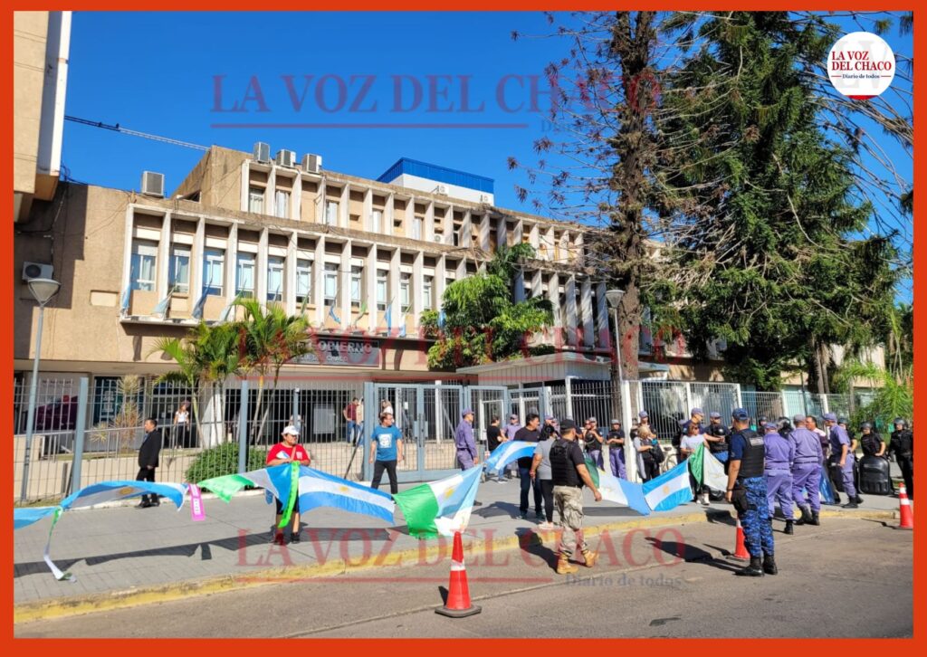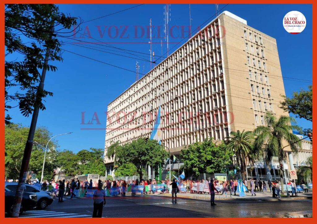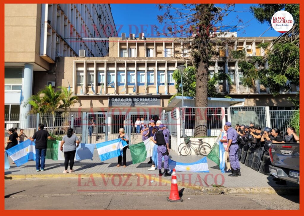 Trabajadores del Ministerio de Producción realizaron este viernes un abrazo simbólico a la Casa de Gobierno con banderas argentinas, en el marco de una serie de reclamos que vienen realizando desde esta semana. Previamente, se movilizaron hasta la Legislatura chaqueña para exigir explicaciones sobre el Fondo Estímulo y otras irregularidades denunciadas.