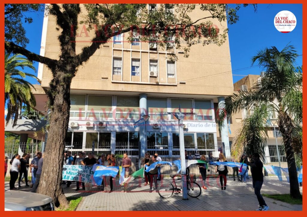 Trabajadores del Ministerio de Producción de Chaco realizaron un abrazo simbólico a Casa de Gobierno y movilizaciones en la Legislatura para exigir explicaciones al ministro Oscar Dudik por la quita del Fondo Estímulo, que dejó a cientos de empleados en situación de vulnerabilidad económica.