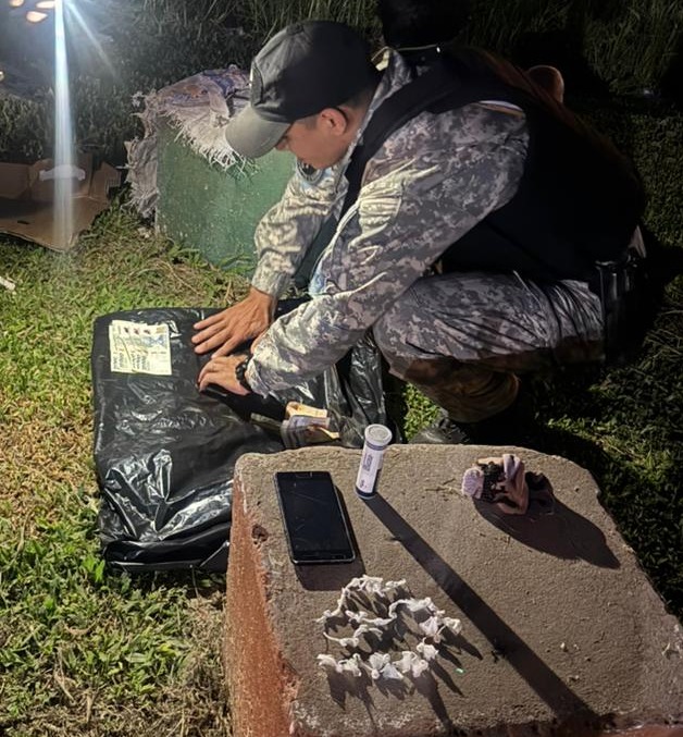 Con la presencia de un testigo hábil, se realizó un palpado de seguridad sobre el joven, hallándose entre sus pertenencias una bolsa transparente con 26 envoltorios de una sustancia blanquecina, además de dinero en efectivo y un teléfono celular.