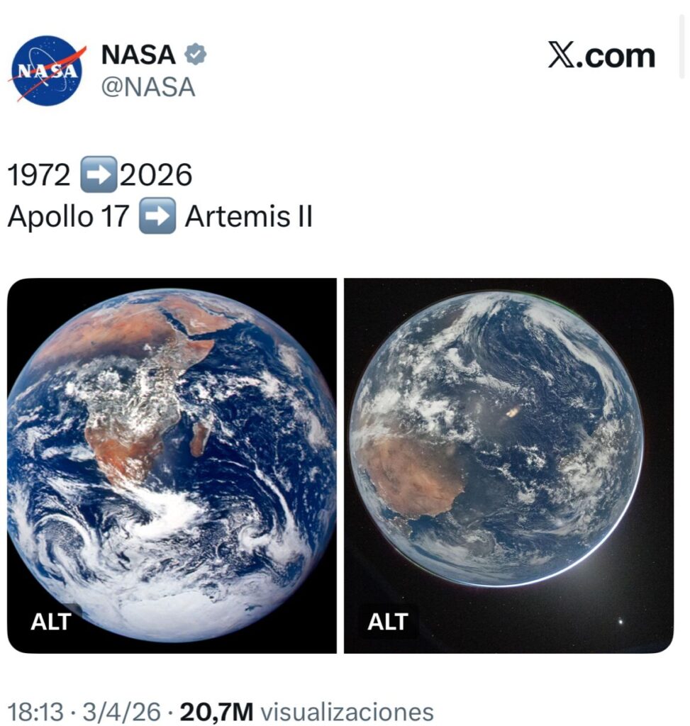 La NASA volvió a sorprender con una impactante comparación que une pasado y presente en la exploración espacial. A través de una publicación reciente, la agencia mostró dos imágenes de la Tierra tomadas con 54 años de diferencia: una captada en 1972 por la misión Apollo 17 y otra obtenida recientemente por Artemis II.