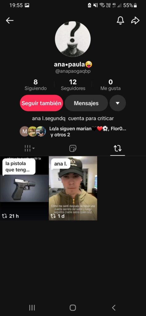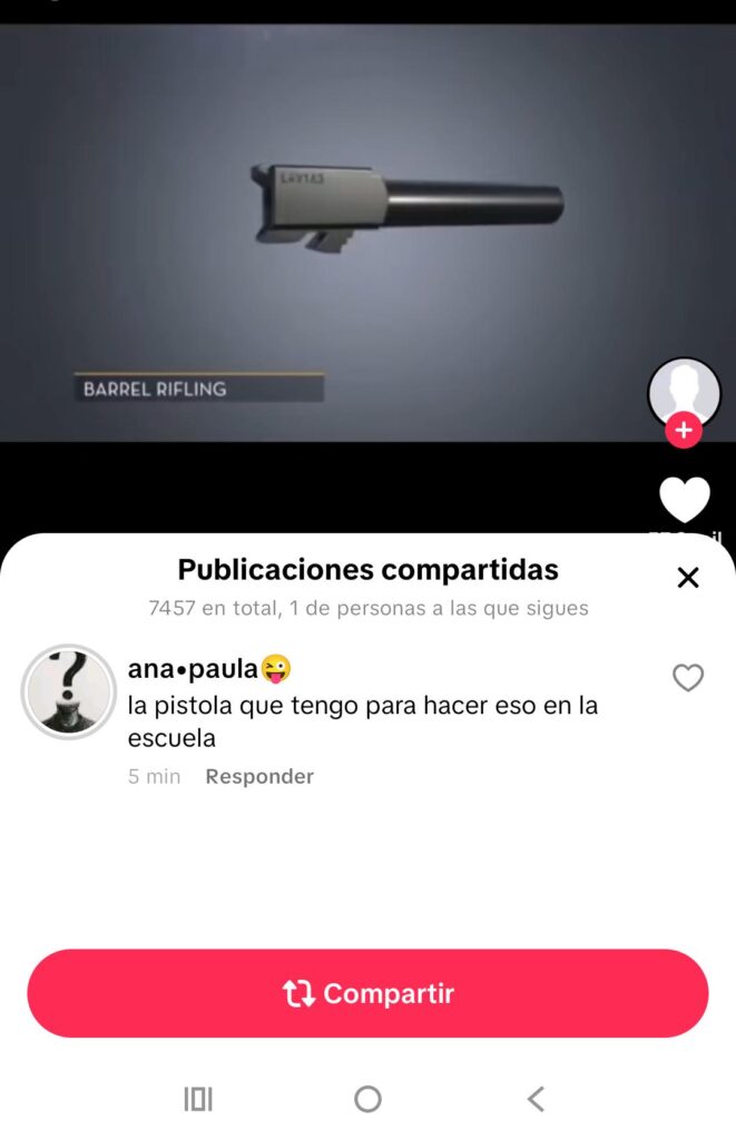 Según consta en la presentación, el perfil identificado como “@anapaogaqb” publicó videos y textos con contenido violento. Entre ellos, se menciona la difusión de una imagen de un arma de fuego acompañada por la frase: “Mi novio entrenó 5 años y te puede partir con una pistola en mi bolsillo”, un mensaje que encendió la preocupación entre padres, docentes y alumnos.