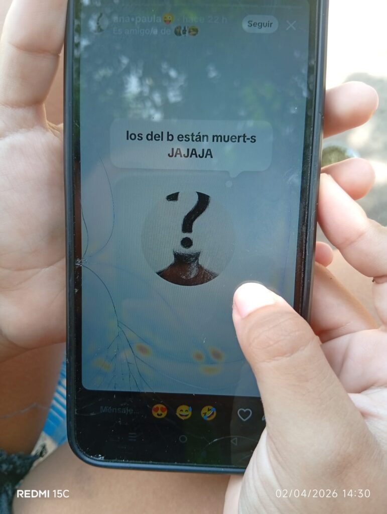 La situación escaló aún más cuando, de acuerdo con la denuncia, desde esa misma cuenta se enviaron mensajes privados a estudiantes, con expresiones como “Los del B están todos muertos jaja”, además de otras amenazas en las que se advertía sobre posibles ataques contra compañeros y alumnos del establecimiento.