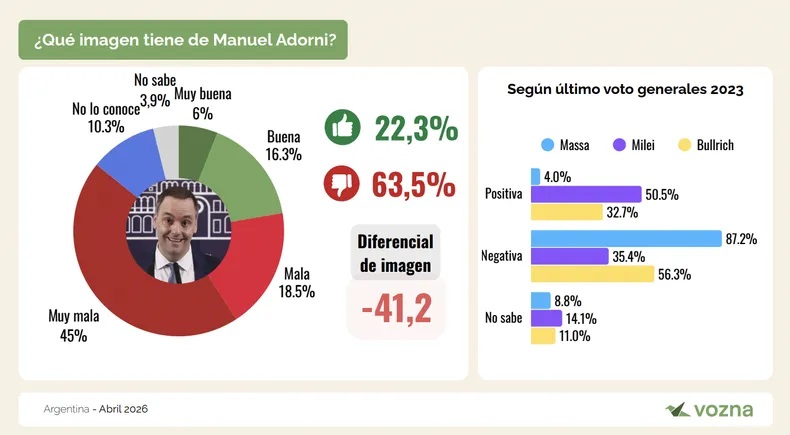 Muchos consultores coinciden en que el duro presente económico, marcado por la pérdida de poder adquisitivo, la caída del consumo y el endeudamiento, impacta con mayor profundidad en un gobierno que prometió combatir a la casta y hoy aparece envuelto en denuncias de corrupción como las que alcanzan al jefe de Gabinete, Manuel Adorni, quien desde su llegada a la función pública adoptó un estilo de vida que no coincide con su declaración patrimonial. En ese marco, la consultora Vozna midió su imagen y detectó que el 61,3% de los encuestados considera que es corrupto y debería renunciar.