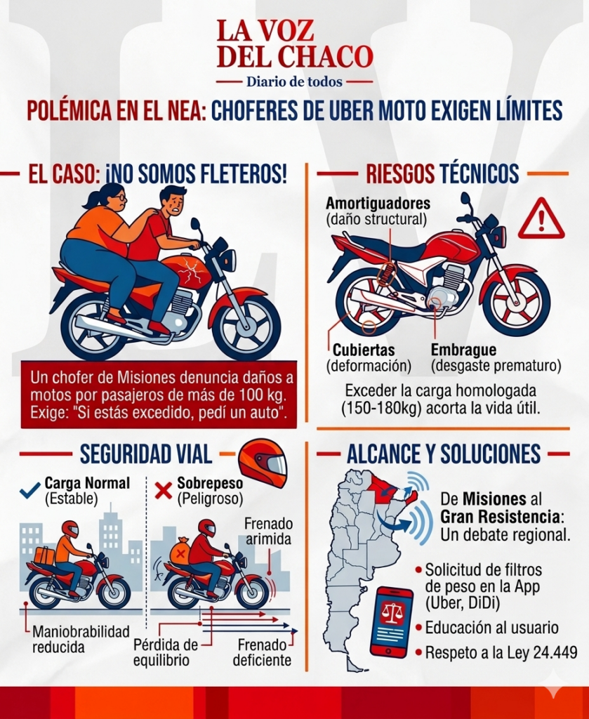 El conflicto se originó en Misiones y ya resuena con fuerza en el Gran Resistencia. Los conductores denuncian que el exceso de carga daña los vehículos y pone en riesgo la seguridad vial. La empresa MEU recordó que las motos tienen un límite técnico de hasta 180 kg.