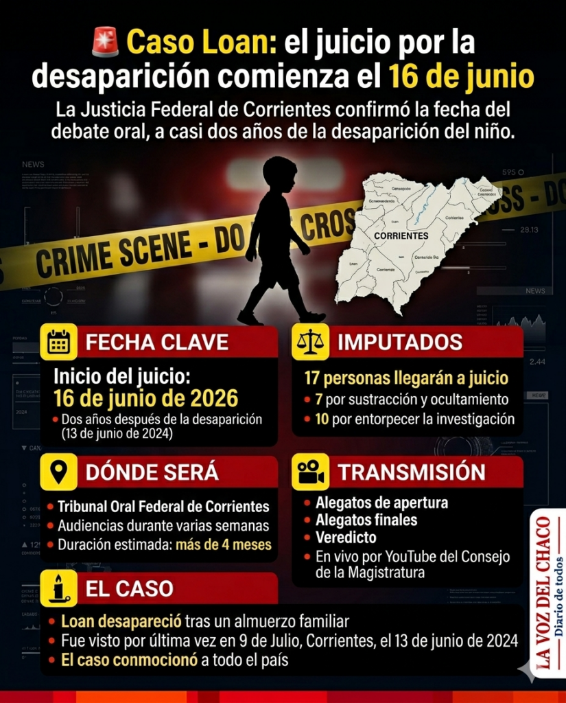 El Tribunal Federal de Corrientes confirmó que el juicio oral y público por el presunto secuestro y ocultamiento de Loan Danilo Peña, el menor desaparecido desde mediados de 2024, comenzará el martes 16 de junio.