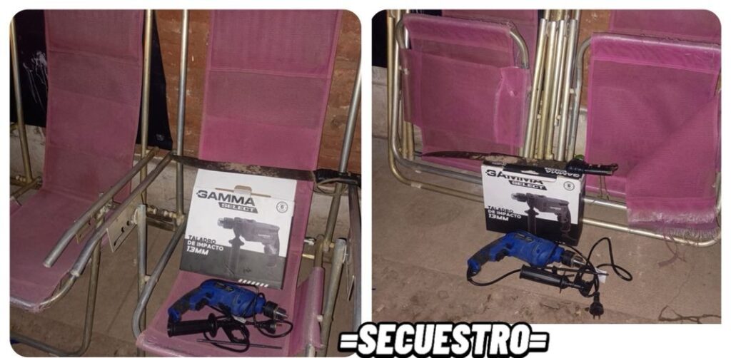 Entre los objetos recuperados se encontraban dos reposeras plegables de aluminio y un taladro marca Gamma Select con su caja original. Además, se procedió al secuestro de un arma blanca tipo machete, con una hoja de aproximadamente 45 centímetros, que habría sido utilizada para perpetrar el ilícito.