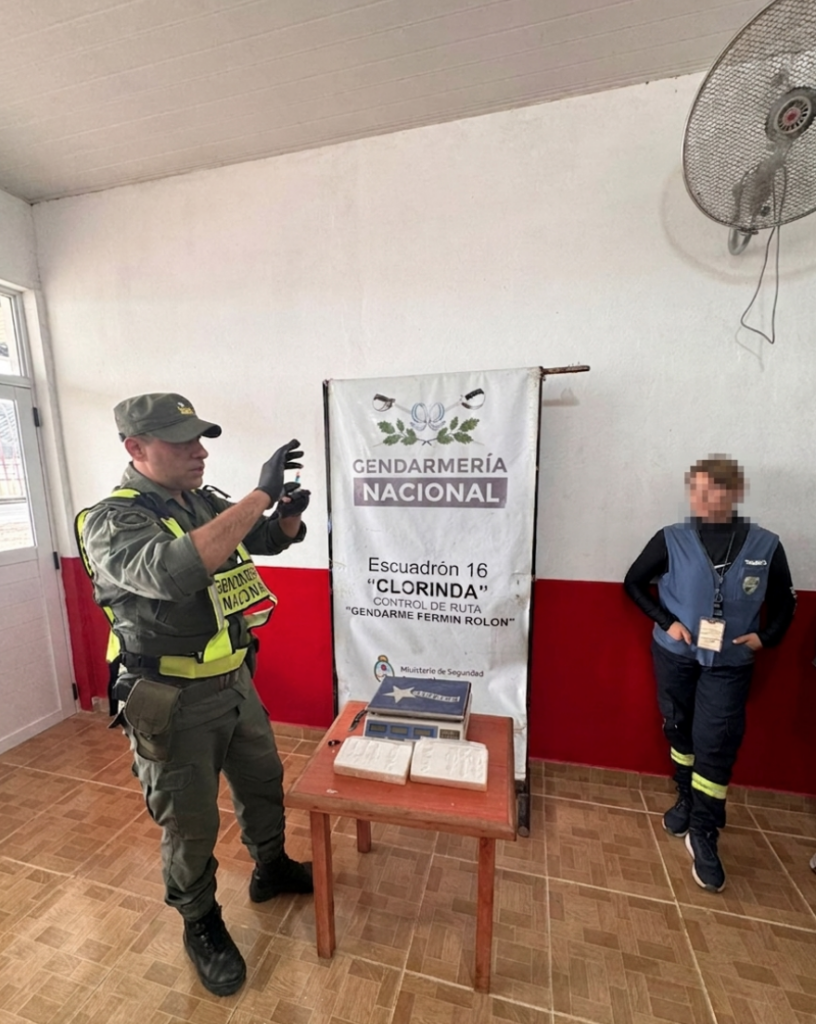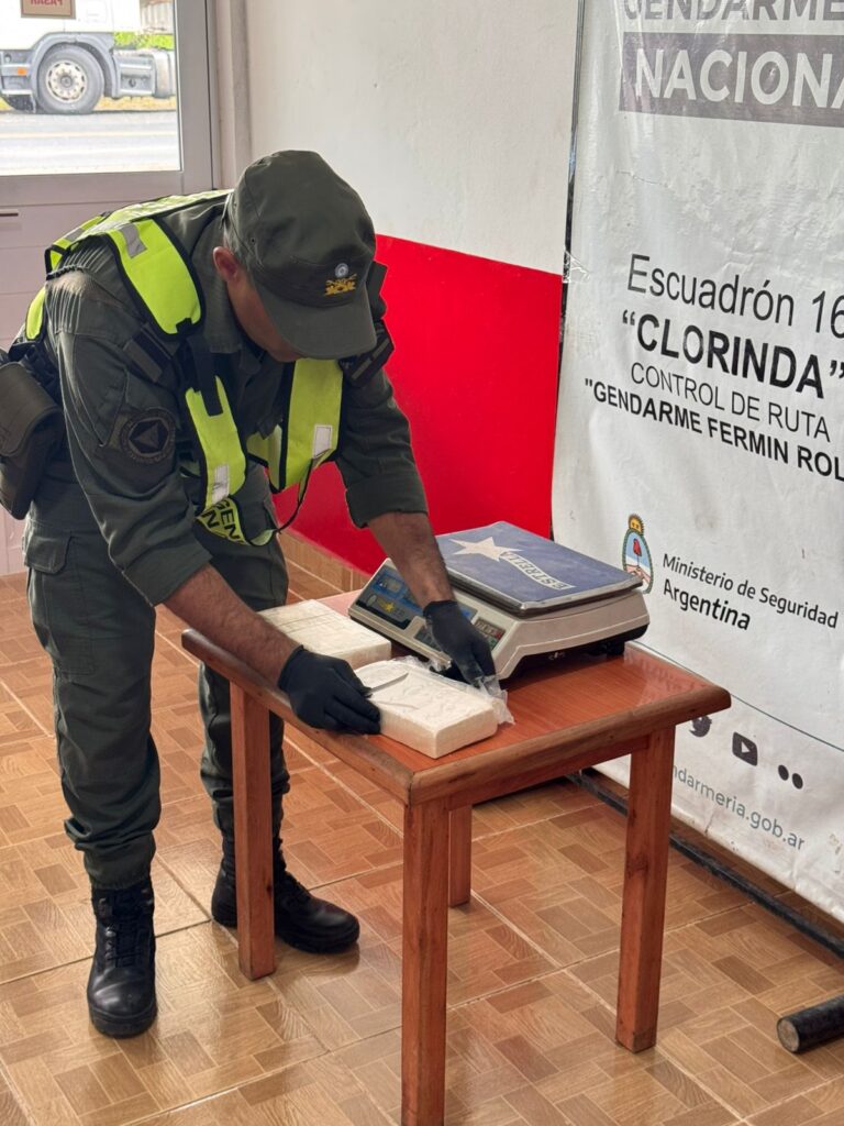 La droga, acondicionada en dos paquetes rectangulares, estaba oculta en su bolso de mano envuelto con una frazada. Se trasladaba en un transporte público de pasajeros desde la localidad formoseña de Clorinda con destino final la provincia de Corrientes.
