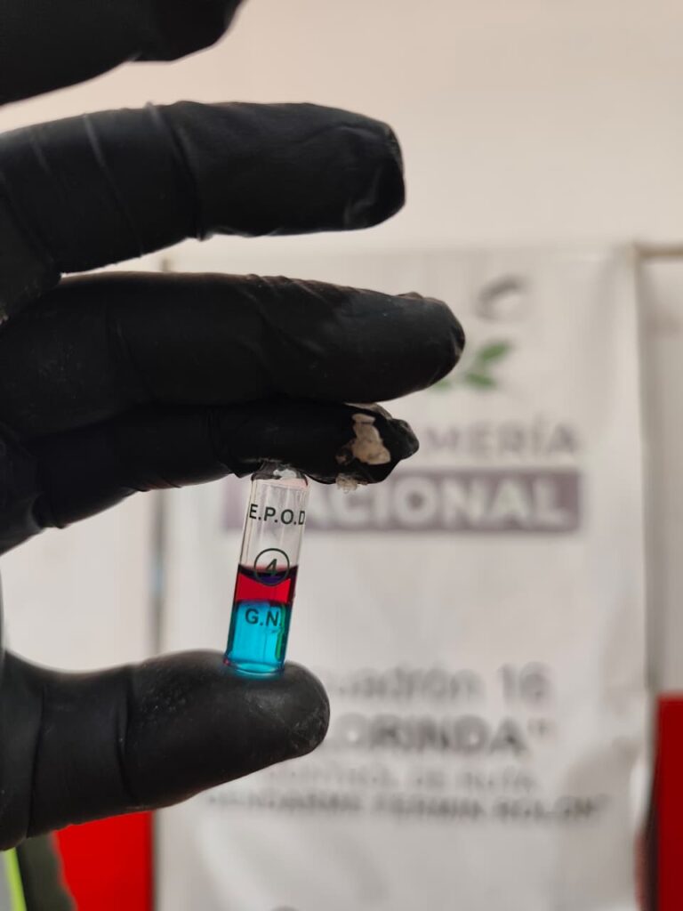 Con la premisa y en presencia de testigos, se procedió a la apertura del bulto hallando envuelto en una frazada dos “panes” que sometidos a pruebas de campo narcotest dio positivo clorhidrato de cocaína; un total de 2 kilos 125 gramos.