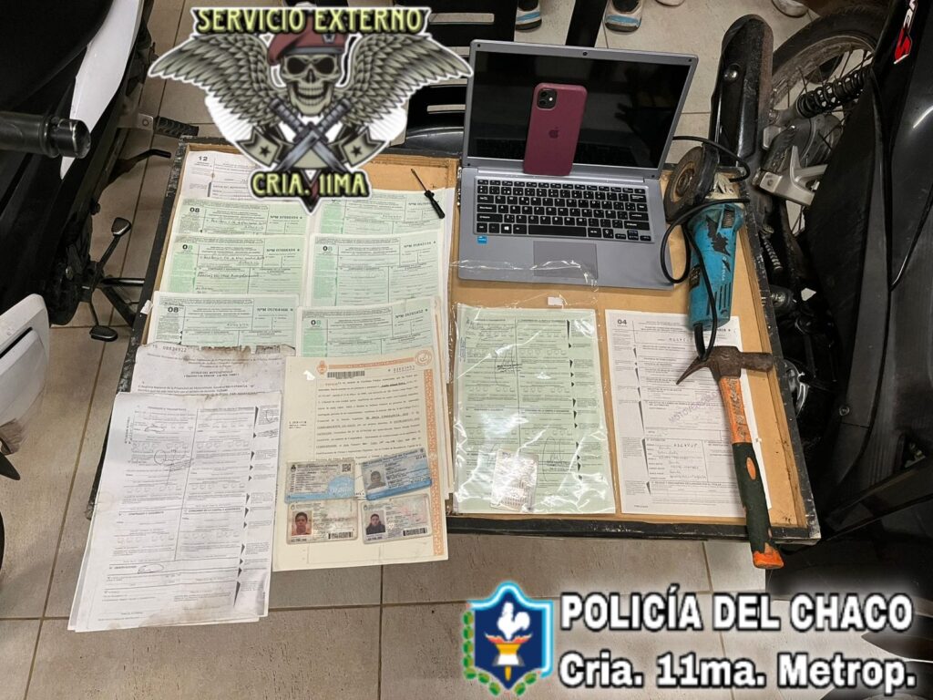 Durante el procedimiento también se secuestró una mochila que contenía diversa documentación vinculada a motovehículos, entre ellos formularios 08, 12 y 04, títulos, cédulas de identificación, constancias y un boleto de compraventa. Además, incautaron herramientas, una notebook y un teléfono celular.