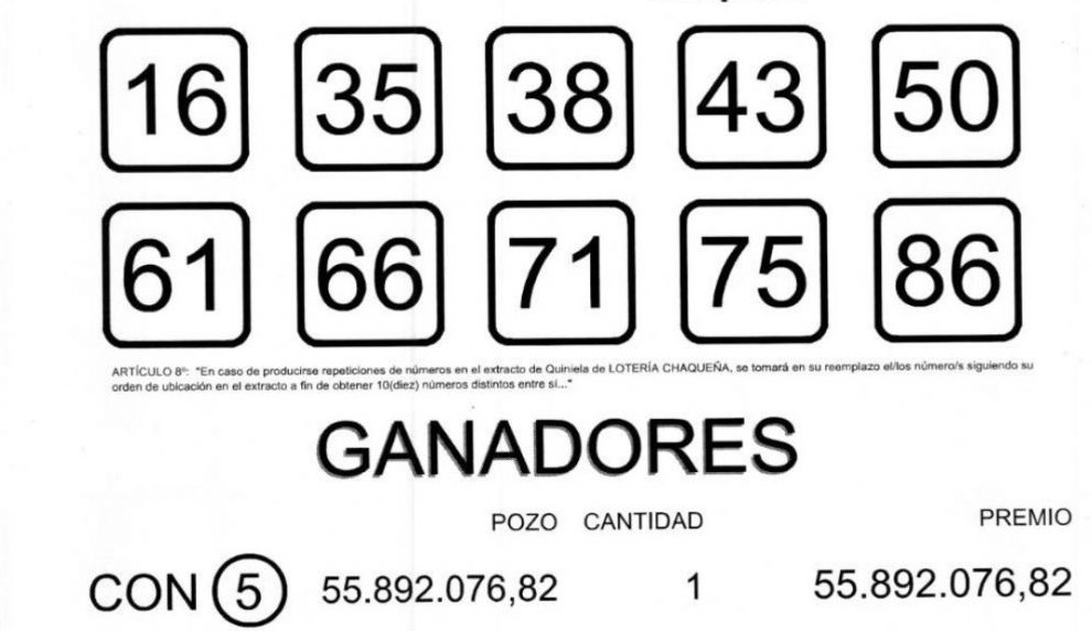 Los números sorteados fueron 16, 35, 38, 43, 50, 61, 66, 71, 75 y 86, en una nueva edición del sorteo que volvió a movilizar a miles de apostadores en toda la provincia.