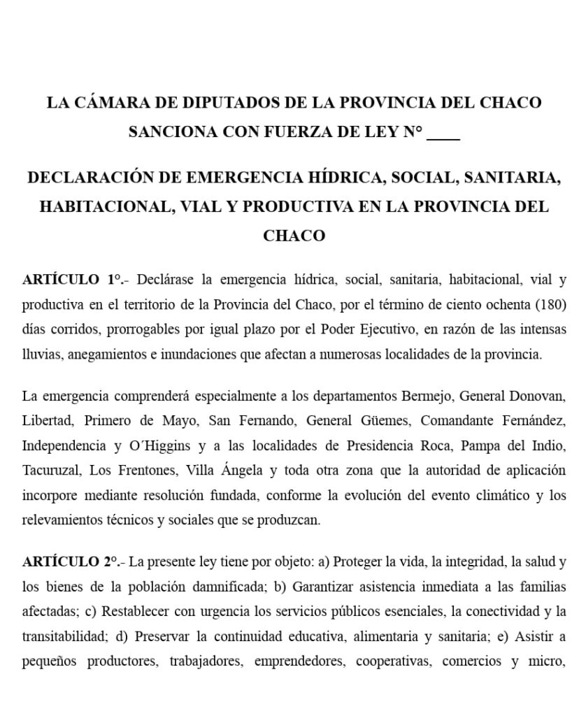 El Interbloque Frente Chaqueño presentó en la Cámara de Diputados un proyecto de ley que declara la emergencia hídrica, social, sanitaria, habitacional, vial y productiva en toda la provincia del Chaco, por un plazo de 180 días prorrogables. La iniciativa surge como respuesta a las intensas lluvias y anegamientos que en las últimas semanas afectaron gravemente a localidades como Juan José Castelli, Villa Río Bermejito, El Espinillo, Miraflores y Presidencia Roque Sáenz Peña, entre otras.