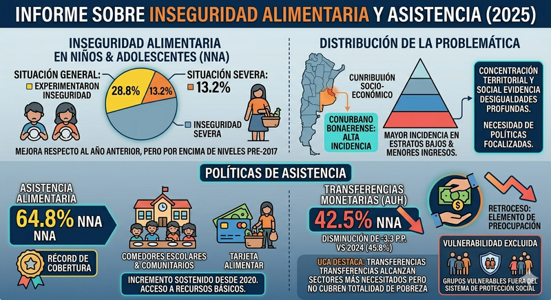 El informe también aborda la problemática de la inseguridad alimentaria, indicando que el 28,8% de los niños y adolescentes experimentó esta situación durante 2025, mientras que un 13,2% lo hizo en su forma más severa.